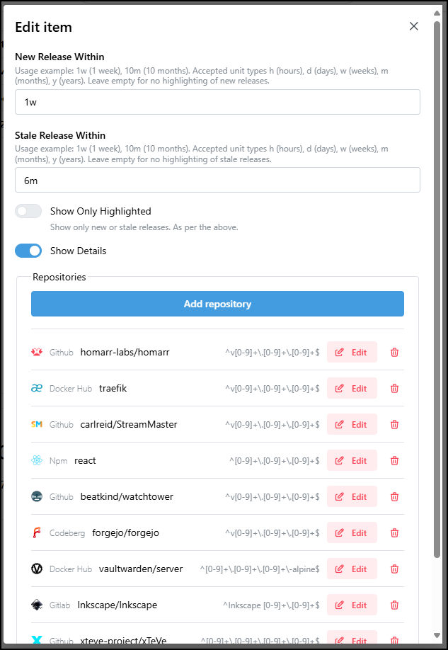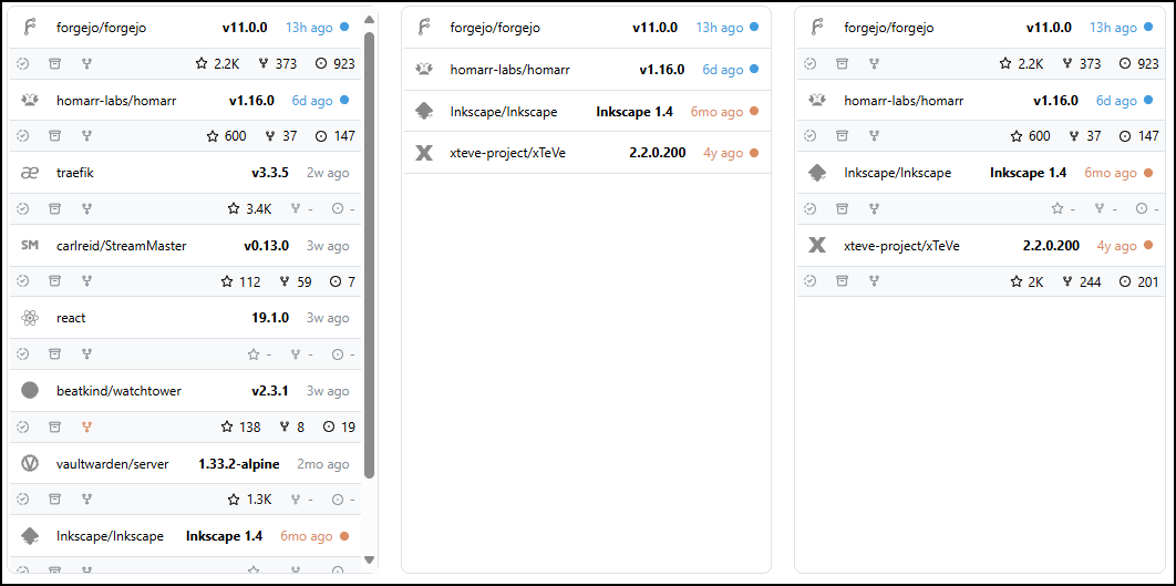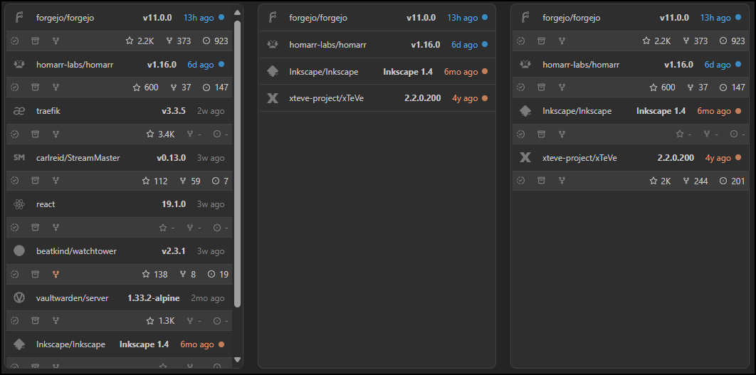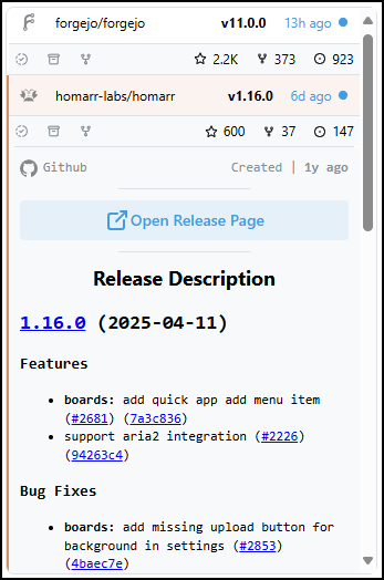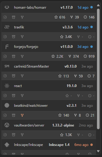 The releases widget enables you to track a list of repositories and see their respective latest release.