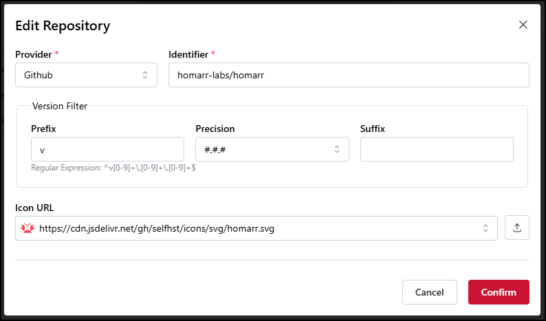 Version FilterA filter to define what format of realease tag the system should track. Can be left empty to track the latest tag.See Configuration for version filter-