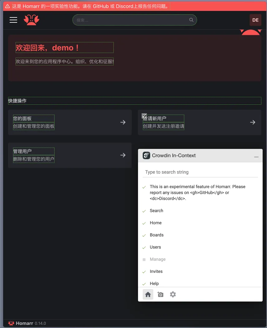 Since v0.14.0, you can now help translate homarr directly from the app ! To do so simply to go your user settings and select "Crowdin (live translations)" as the language. Then you'll be prompted to connect to your Crowdin account and choose the language in which you want to transalte. You can then start translating directly from the app by selecting some text on the app. If some text cannot be selected to be edited with the live translation tool, you can sill translate it inside of the In-Context popup at the Home tab, it will be red if it's not translated yet.